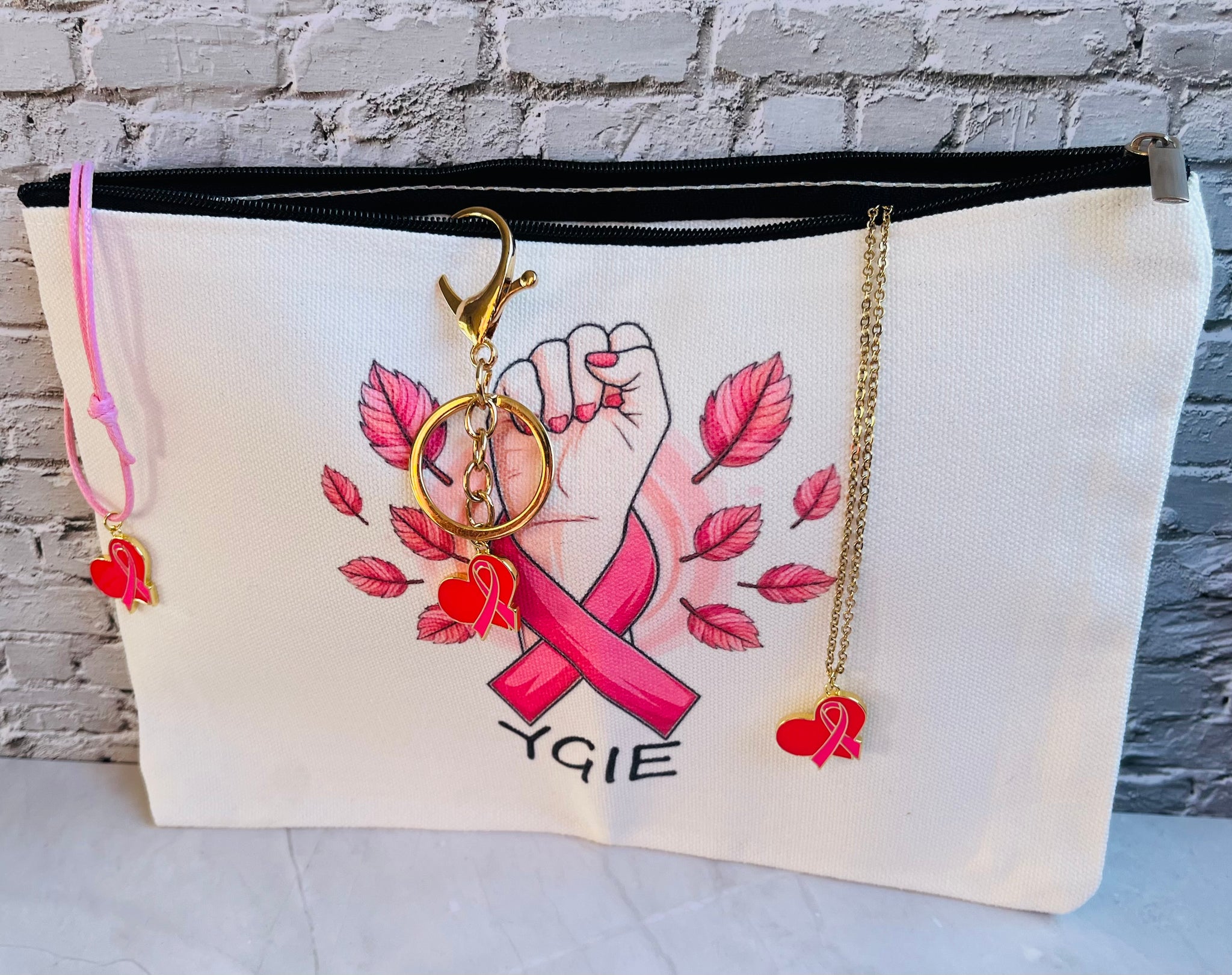 Parure avec pochette Collier, bracelet et porte clé lutte contre le cancer du sein Spécial Octobre rose