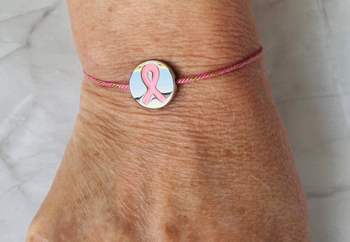 Bracelet octobre rose en Coton Rose fils d’or Coulissant pendentif acier ruban rose
