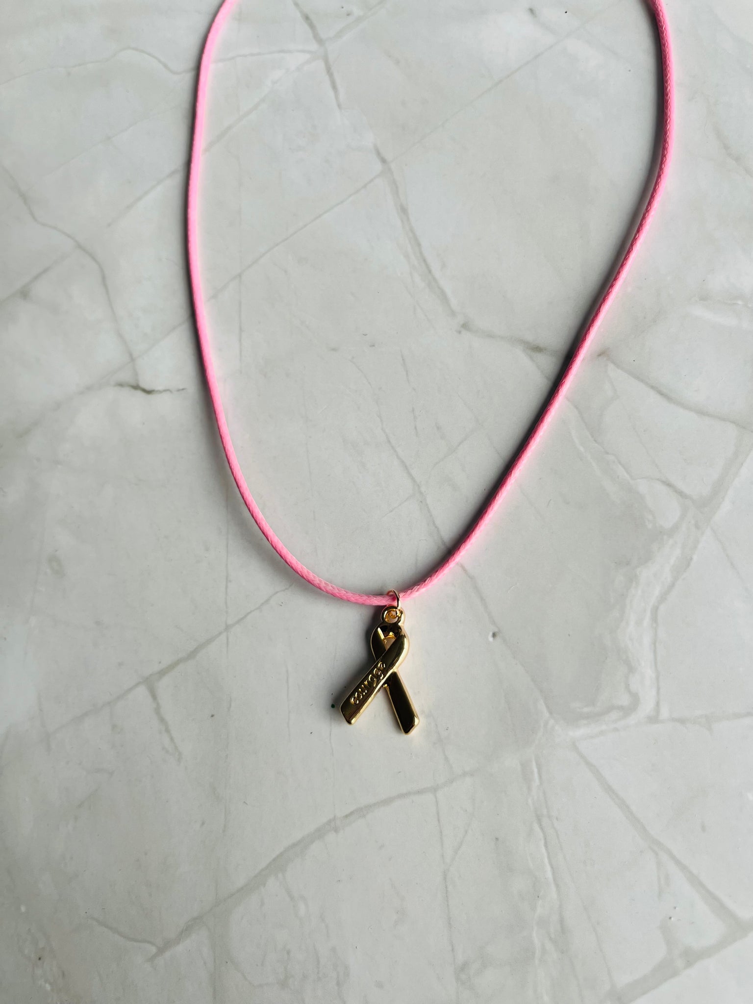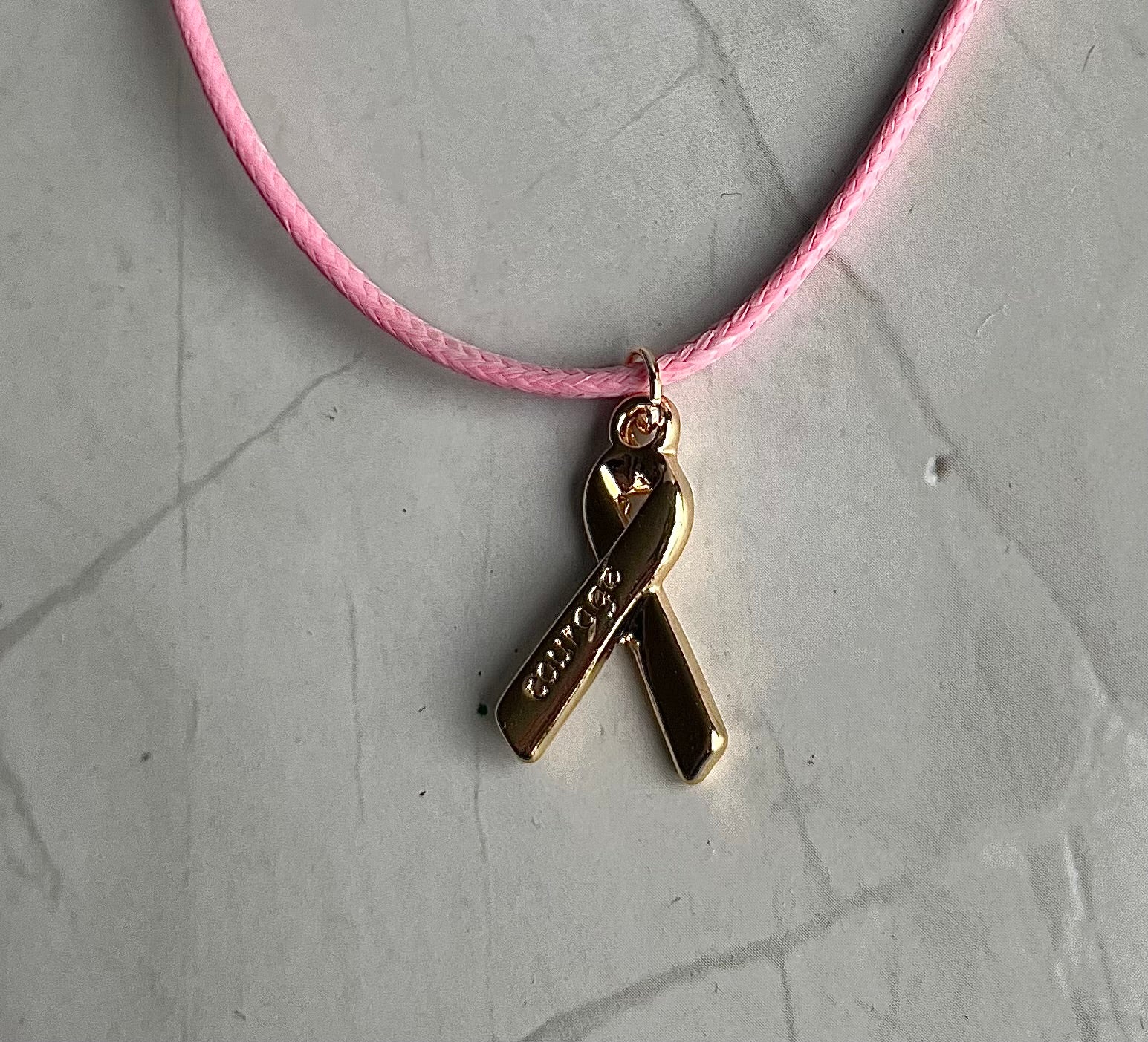 Collier solidaire Octobre Rose Cordon rose pendentif ruban avec l'inscription courage doré