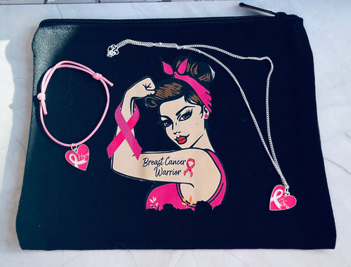 Pochette cadeau octobre rose parure collier cœur ruban Hope et bracelet doré